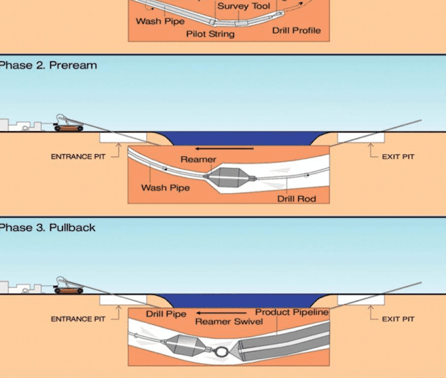 In contrast, horizontal directional drilling minimises disruption to the surface during pipe building. Using a guided drilling machine, the process entails drilling a very tiny pilot hole from the entry site to the exit point. The drill head is steered underground along the intended path, which can be changed in real-time to avoid impediments like trees.